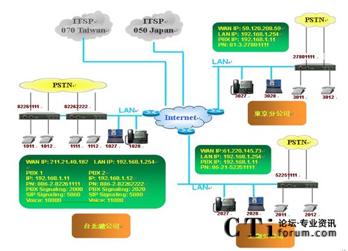 在上圖的架構(gòu)中,各點(diǎn)皆使用MOSA 4604A Plus,皆為2個FXS、2個FXO、4個SIP外線及30個SIP分機(jī)的型號,F(xiàn)XO接在當(dāng)?shù)氐腜STN(公眾交換電信網(wǎng)絡(luò))上,F(xiàn)XS則接在一般的話機(jī)上,另各有30的SIP分機(jī)可供其它SIP設(shè)備(如SIP