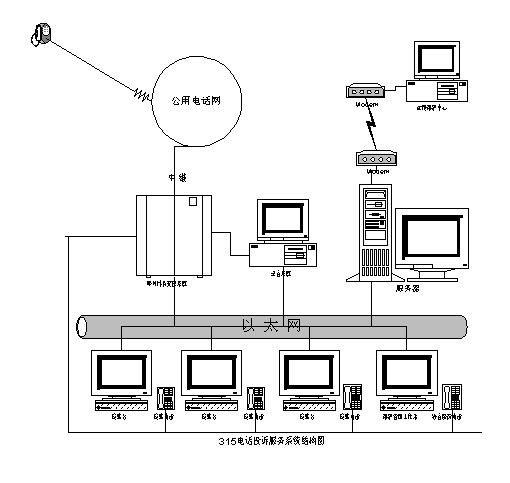 | ZQ-315電話投訴服務(wù)系統(tǒng)由如下各部分組成: 4呼叫排隊(duì)交換系統(tǒng) 4座席臺 4數(shù)據(jù)庫服務(wù)器 4系統(tǒng)維護(hù)管理臺 4同步數(shù)字錄音系統(tǒng) 4遠(yuǎn)程通訊模塊 4遠(yuǎn)程維護(hù)終端 各部分通過集線器和五類雙絞線組成快速以太網(wǎng);各節(jié)點(diǎn)之間采用TCPAP協(xié)議,以 Socket方式進(jìn)行通訊。其組成結(jié)構(gòu)如下圖所示。 ![]() 1.呼叫排隊(duì)交換系統(tǒng) 4與公用電話網(wǎng)相連,將來話分配到座席臺或遇忙排隊(duì) 4自動應(yīng)答來話,完成自動受理投訴與自動查詢服務(wù) 4進(jìn)行呼叫轉(zhuǎn)移 2.座席臺 4人工應(yīng)答來話 4顯示主叫號碼、戶主與地址等信息(根據(jù)需要) 4計(jì)算機(jī)輔助投訴受理 4計(jì)算機(jī)輔助業(yè)務(wù)咨詢(法律。個案等) 3.?dāng)?shù)據(jù)庫服務(wù)器 4運(yùn)行網(wǎng)絡(luò)操作系統(tǒng) 4運(yùn)行數(shù)據(jù)庫系統(tǒng) 4提供各種數(shù)據(jù)服務(wù) 4對網(wǎng)絡(luò)安全性進(jìn)行檢查控制 4.系統(tǒng)維護(hù)管理臺 4對數(shù)據(jù)庫進(jìn)行維護(hù)管理 4查詢各種業(yè)務(wù)數(shù)據(jù),生成統(tǒng)計(jì)報表。 5.同步數(shù)字錄音系統(tǒng) 4將模擬話音轉(zhuǎn)換成數(shù)字信號,并壓縮存儲。多路錄音,互不干擾 4支持多種語音數(shù)據(jù)壓縮格式(如PCMchDPCM、WAV等) 4播放放音 6.遠(yuǎn)程通訊模塊 4與上級或遠(yuǎn)程系統(tǒng)進(jìn)行通訊。 7.遠(yuǎn)程維護(hù)終端 4遠(yuǎn)程撥號登陸系統(tǒng),對系統(tǒng)進(jìn)行全面維護(hù) |