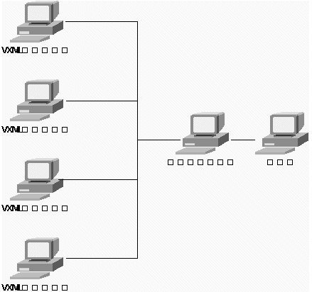 在數(shù)據(jù)中心設(shè)置VXML服務(wù)器,提供訪問(wèn)互聯(lián)網(wǎng)絡(luò)的接口,地市臺(tái)與中心服務(wù)器使用標(biāo)準(zhǔn)的基于應(yīng)用層的協(xié)議通訊。地市臺(tái)與數(shù)據(jù)中心交換網(wǎng)頁(yè)和其他數(shù)據(jù),這種交換是實(shí)時(shí)的。各地市的電話用戶就能利用運(yùn)營(yíng)商提供本地電話號(hào)碼訪問(wèn)互聯(lián)網(wǎng)上的信息。