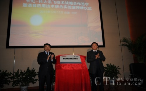 CTI論壇(ctiforum)12月14消息(記者 潘婷婷): 12月12日,科大訊飛與長(zhǎng)虹集團(tuán)戰(zhàn)略合作簽約暨共建聯(lián)合實(shí)驗(yàn)室揭牌儀式在科大訊飛語(yǔ)音產(chǎn)業(yè)基地研發(fā)大樓隆重舉行。根據(jù)合作框架協(xié)議,雙方將在戰(zhàn)略聯(lián)盟的基礎(chǔ)上,以共建聯(lián)合實(shí)驗(yàn)室為主要載體,旨在依托各自行業(yè)領(lǐng)域的長(zhǎng)期積淀優(yōu)勢(shì)、強(qiáng)強(qiáng)聯(lián)合,達(dá)成戰(zhàn)略互信,加強(qiáng)緊密合作,積極推動(dòng)“語(yǔ)音核心引擎+智能終端平臺(tái)” 的特色應(yīng)用模式,深入拓展智能語(yǔ)音科技在智能電視等終端產(chǎn)品市場(chǎng)的應(yīng)用范圍,合力開創(chuàng)智能語(yǔ)音終端創(chuàng)新應(yīng)用市場(chǎng)空間。