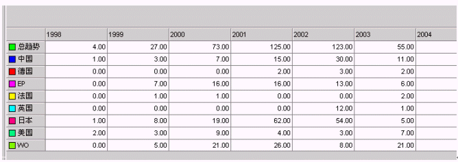 從圖1分析,98-2004年該領域技術發(fā)展大致分為3個周期,即98-2000年、2001-2003年、2003-2004年。目前正處于第三個周期后期。