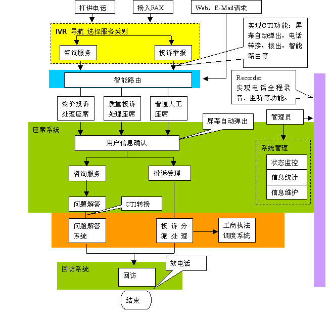 黎明網(wǎng)絡(luò)深入研究世界上最新的CTI技術(shù)的發(fā)展和應(yīng)用,自主研發(fā)推出的12315消費(fèi)者投訴受理系統(tǒng)采用當(dāng)前主流的一體化的呼叫中心模式。一體化的呼叫中心模式具有投資少、易于實(shí)施、維護(hù)工作量較小、維護(hù)成本低的優(yōu)點(diǎn)。該系統(tǒng)建立在內(nèi)部以太網(wǎng)基礎(chǔ)上,不同網(wǎng)絡(luò)(PSTN網(wǎng)、IP網(wǎng)、GSM/GPRS/CDMA網(wǎng))的消費(fèi)者可以通過多種方式(電話、傳真、E-mail、短消息等)接入12315系統(tǒng),利用系統(tǒng)提供的服務(wù)進(jìn)行投訴舉報(bào)或咨詢。