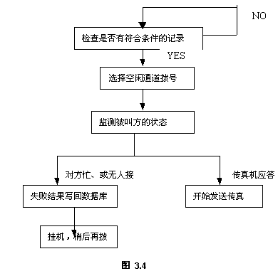 傳真發(fā)送功能是服務(wù)器后臺(tái)操作的,系統(tǒng)定時(shí)檢查傳真發(fā)送庫,一旦有符合條件的記錄,自動(dòng)選擇空閑端口,按設(shè)定的傳真號(hào)碼撥號(hào),檢查被叫方的狀態(tài),若對方有傳真機(jī)應(yīng)答,則開始發(fā)送傳真;若對方忙、或無人接,系統(tǒng)稍后會(huì)再次試撥。若超過設(shè)定次數(shù)仍未發(fā)送成功,系統(tǒng)會(huì)通知發(fā)送人作其它處理。