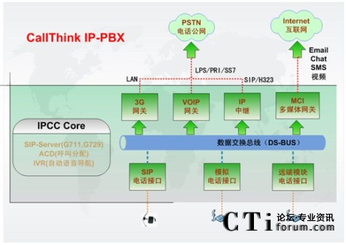 IPCC Core是IP-PBX的核心部分,提供了配置IP分機(jī)號(hào)碼(Extension Number)、功能按鈕以及通話管理和ACD路由策略功能;它可以支持多達(dá)1000個(gè)IP語(yǔ)音終端呼叫請(qǐng)求,通過(guò)分組交換,實(shí)現(xiàn)IP分機(jī)、普通分機(jī)、互聯(lián)網(wǎng)上IP電話之間的互聯(lián)互通;通過(guò)Voip網(wǎng)關(guān),可以實(shí)現(xiàn)IP網(wǎng)絡(luò)和傳統(tǒng)電路交換電話網(wǎng)的通信,完成異種網(wǎng)絡(luò)的電話呼入和呼出;