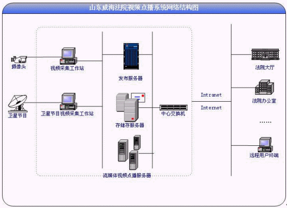 威海中級人民法院VOD應用建設包括:用戶認證系統(tǒng)、遠程上傳系統(tǒng)、內容分發(fā)系統(tǒng)、內容播放系統(tǒng)(流媒體)、網(wǎng)站內容系統(tǒng)等部分。