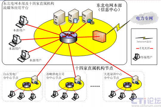 針對東北電網(wǎng)有限公司的需求,系統(tǒng)采用分布式網(wǎng)絡(luò)結(jié)構(gòu),并在14個直屬分支機(jī)構(gòu)部署CDN分節(jié)點,中心機(jī)房架設(shè)一臺WEB服務(wù)器,1臺數(shù)據(jù)庫服務(wù)器,1臺流媒體服務(wù)器作為CDN中心服務(wù)器,1臺直播發(fā)布服務(wù)器、2臺直播采集工作站,14個分支機(jī)構(gòu)分別架設(shè)1臺流媒體服務(wù)器作為CDN邊緣服務(wù)器,具體配置如下: