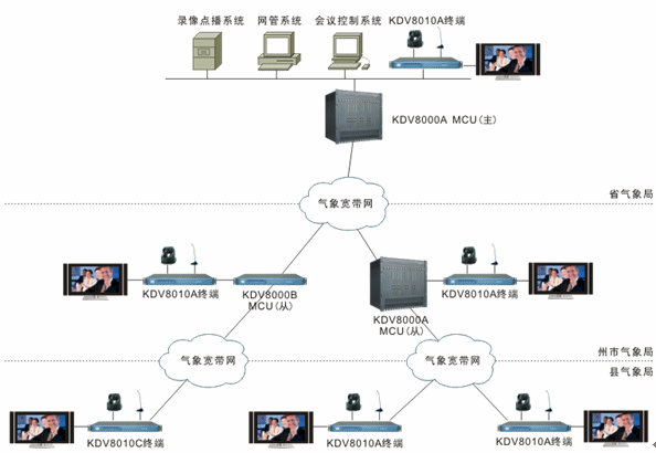 二期工程將實現(xiàn)州市到縣的建設(shè)。屆時,州市氣象局既是省氣象局的遠端節(jié)點又是縣氣象局的中心點,可根據(jù)情況部署KDV8000A或KDV8000B多點控制單元,向上與省氣象局多點控制單元級聯(lián),向下與縣氣象局視頻會議終端相連。州市氣象局在一期工程中已配視頻會議終端,因此二期工程僅需在各縣氣象局部署KDV8010A或KDV8010C視頻會議終端各1臺即可,通過氣象寬帶網(wǎng)接入州市氣象局的多點控制單元。