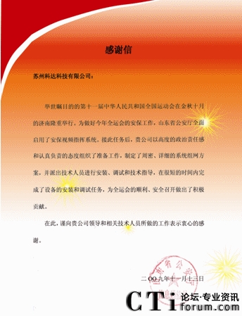 CTI論壇(ctiforum)12月29日消息(記者 張塵):日前 ,山東省公安廳向蘇州科達科技有限公司發(fā)來感謝信,對蘇州科達為保障全運會順利、安全召開所做的貢獻表示衷心的感謝。