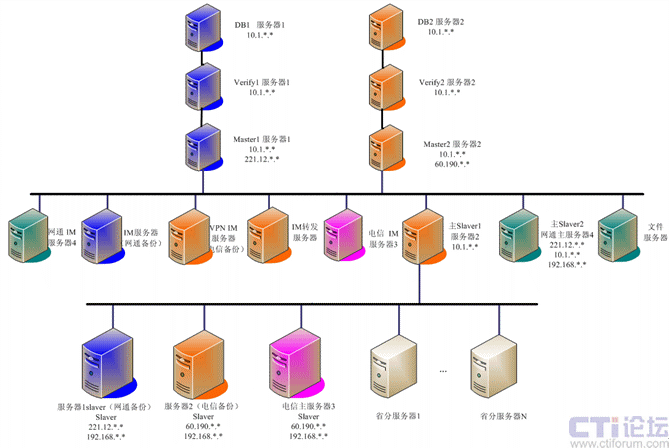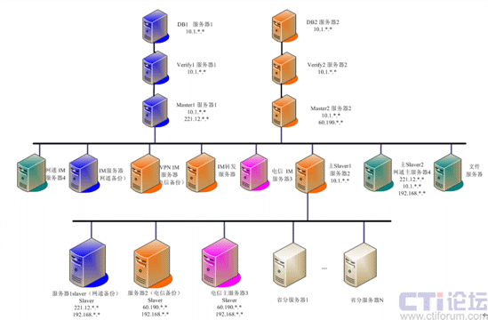 系統(tǒng)基礎平臺的部署采用4臺物理服務器方式實現,四臺物理服務器分別有多塊網卡,為不同網絡用戶提供不同服務,同時實現實現核心數據的冗余、備份。在二級機構,即在省級每個省部署一臺分服務器,實現當地用戶的數據轉發(fā)等任務,系統(tǒng)部署入下圖所示: