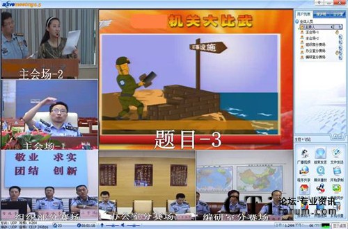本次架設的空軍大比武平臺,滿足了總部主持指揮協(xié)調(diào)和各二級部參加比賽的應用。總部與各二級部分別架設網(wǎng)動視頻會議硬件終端,分會場觀眾通過登錄網(wǎng)動統(tǒng)一通信平臺Active UC®觀看實時比賽畫面,并與現(xiàn)場互動、點評。總部主持人可共享參賽部門的答題桌面,把答題結(jié)果展現(xiàn)給評委和各會場觀眾。系統(tǒng)可實現(xiàn)舉手搶答,答題結(jié)果實時上傳等貼心功能。