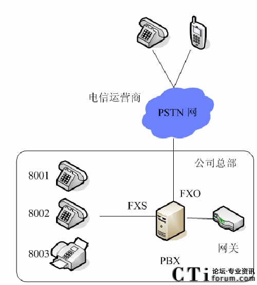 公司總部增加一臺(tái)語音網(wǎng)關(guān),通過中繼線與原有的PBX相連,異地分公司增加一臺(tái)IPPBX,下面開通分機(jī),公司總部和分公司通過IP網(wǎng)連接在了一起。
