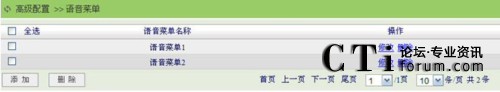 點(diǎn)擊“高級(jí)配置”菜單的“語(yǔ)音菜單”子菜單,進(jìn)入語(yǔ)音菜單頁(yè)面,頁(yè)面默認(rèn)顯示系統(tǒng)已經(jīng)配置的所有語(yǔ)音菜單列表信息,在這里用戶可以創(chuàng)建新的語(yǔ)音菜單、修改刪除已有的語(yǔ)音菜單,如下圖所示: