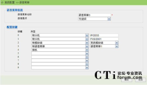 在此頁(yè)面可以定義語(yǔ)音菜單的名字,可以指定進(jìn)入此菜單后播放的音樂,還可以為每個(gè)鍵選擇合適的操作。支持0-9數(shù)字按鍵定義,每個(gè)鍵可選擇如下五個(gè)動(dòng)作之一:
