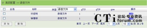 點(diǎn)擊“高級(jí)配置”菜單的“語(yǔ)音文件”子菜單,進(jìn)入語(yǔ)音文件頁(yè)面,在類型選項(xiàng)中可以選擇顯示語(yǔ)音文件或音樂保持文件,語(yǔ)音文件指的是語(yǔ)音菜單、振鈴組等業(yè)務(wù)使用的語(yǔ)音文件;音樂保持文件指的是呼叫保持,三方通話等業(yè)務(wù)用戶聽到的音樂保持文件。如下圖所示: