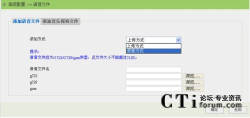 在定制語(yǔ)音菜單時(shí),經(jīng)常要提供聲音文件,目前系統(tǒng)支持G.723、G.729和gsm(針對(duì)G.711a和G.711u)類型的語(yǔ)音文件和音樂保持文件,單個(gè)文件大小不能超過512K。MG3000-X中的語(yǔ)音文件可以通過錄制或者上傳方式提供。