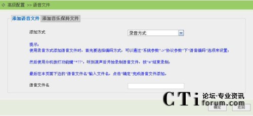 選擇錄音方式添加語(yǔ)音文件時(shí),使用分機(jī)撥打電話錄制語(yǔ)音文件功能鍵“*77”,聽到滴聲后開始錄制,按“#”號(hào)結(jié)束錄制。然后通過“高級(jí)配置”->“語(yǔ)音文件”,點(diǎn)擊“添加”鏈接按鈕進(jìn)入添加語(yǔ)音文件頁(yè)面,選擇添加方式為錄音方式,在語(yǔ)音文件名處為剛剛電話錄制的音文件,添加一個(gè)文件名后,點(diǎn)擊“確定”完成語(yǔ)音文件添加,如下圖所示: