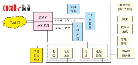 華呼(www.cncall.com)典型的基于交換機(jī)平臺(tái)廣電呼叫中心解決方案的主系統(tǒng)包括:PBX交換機(jī)平臺(tái)、計(jì)算機(jī)電話集成系統(tǒng)(CTI)、交互式語(yǔ)音應(yīng)答系統(tǒng)(IVR/IFR)、人工座席系統(tǒng)、電話錄音監(jiān)聽(tīng)管理系統(tǒng)CCLog、呼叫中心管理系統(tǒng)CCM、數(shù)據(jù)庫(kù)應(yīng)用系統(tǒng)、WWW服務(wù)器、應(yīng)用網(wǎng)關(guān)。