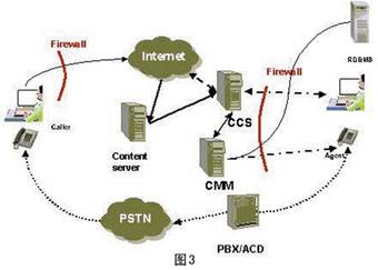 ----圖2說(shuō)明了在集成互聯(lián)網(wǎng)電話(huà)網(wǎng)關(guān)時(shí)進(jìn)行協(xié)同會(huì)話(huà)的流程,圖中實(shí)線(xiàn)為數(shù)據(jù)信息傳遞的鏈路,虛線(xiàn)為語(yǔ)音傳遞的鏈路。通過(guò)ITG和PBX/ACD 的特定交互接口,將呼叫中心外部的IP電話(huà)鏈路集成到CCIS系統(tǒng)中。值得注意的是,ITG 和CCS需要安裝在企業(yè)防火墻的外側(cè),以方便呼叫者的訪(fǎng)問(wèn)。