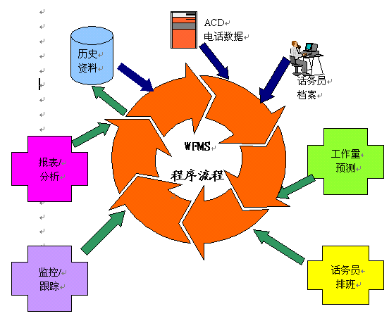 如上面所描述的WFMS流程,最初開始于歷史的電話信息、目前的ACD數(shù)據(jù)和服務(wù)代表的簡介。從這些綜合的信息,做出對工作量的預(yù)測,從而從本質(zhì)上決定了配備給呼叫中心的服務(wù)代表數(shù)量。了解了服務(wù)代表的需求數(shù)量,一個(gè)適用于任何時(shí)間段的工作時(shí)間表就可以產(chǎn)生了,包括每天的,每周的,每月的;谶@一點(diǎn),主管人就可以監(jiān)控服務(wù)代表的行為,追蹤來電,并分析不同種類的來電分組,做出應(yīng)對假定情景的方案,從而產(chǎn)生各種各樣的報(bào)告和圖表。