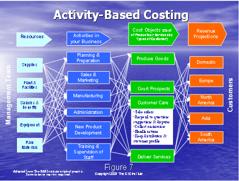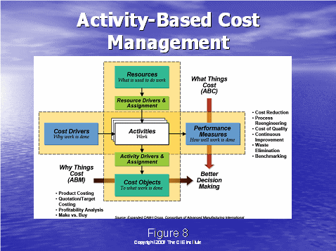 通過了解圖8,我們將以行動成本管理大體是什么的總括作為結束。我們從左邊的成本驅動因素開始——這是做工作的原因,例如:獲得客戶,維持客戶。就如圖4中所說的,這些成本驅動因素可以細分到工作行動上去。可以通過描述人,培訓,設備和技術資源來組成工作行動。資源驅動因素被用于分配這些企業(yè)成本到各個行動上去。下一步就是系統(tǒng)地確定行動驅動因素,分配行動成本到成本對象上去,這有利于決策的制定。例如,獲得一個客戶和維持一個客戶需要花費多少的成本?