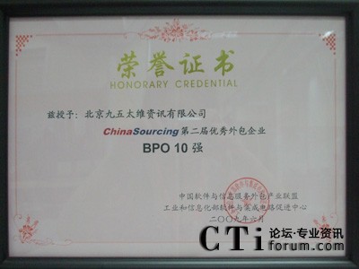 CTI論壇(ctiforum)06月16日消息: 日前,從國家工業(yè)和信息化部傳來喜訊:北京九五太維資訊有限公司2009年蟬聯(lián)“中國BPO企業(yè)10強(qiáng)”。