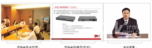 在主會場,分會場的會議室配備H3C高清視訊終端MG6060。H3C MG6060終端支持H.263、H.264等視頻編解碼協(xié)議,并采用了專有的視頻前、后處理技術,使得圖像質量大大提升,在周圍環(huán)境光照較差或者會場顏色搭配不甚和諧的情況下,仍舊能夠得到清晰、自然的圖像。視頻功能主要特色功能包括動態(tài)4CIF高清圖像、H.239雙視頻流傳送、畫中畫(PIP)、雙屏顯示、分屏顯示、VGA輸入、VGA輸出、桌面?zhèn)魉、圖像屏蔽、圖像參數(shù)調整等。有關H3C