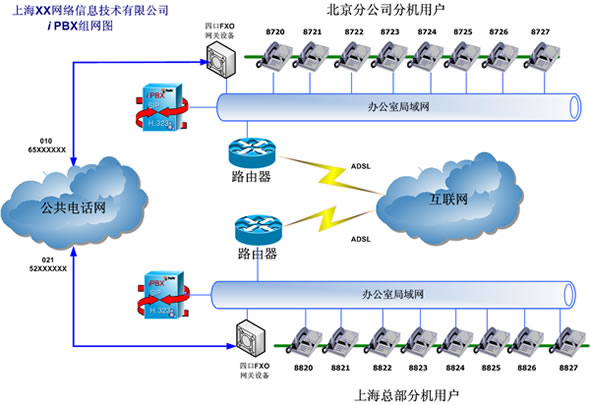 根據(jù)該用戶解決內(nèi)部通訊費(fèi)用的要求,在北京和上海兩個(gè)iPBX系統(tǒng)之間實(shí)現(xiàn)互通。兩套iPBX的外線通過普通模擬網(wǎng)關(guān)的FXO口與現(xiàn)存的PSTN線連接。