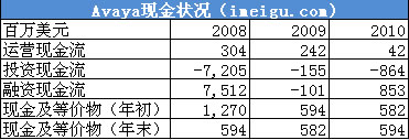 2008、2009、2010財年Avaya公司運營現(xiàn)金流分別為3.04億美元、2.42億美元、4200萬美元,2010財年運營現(xiàn)金流急劇減少因并購北電的企業(yè)通信部門(NES)影像所致,截至2010財年(即2010年9月30日)Avaya公司現(xiàn)金及等價物為5.94億美元。