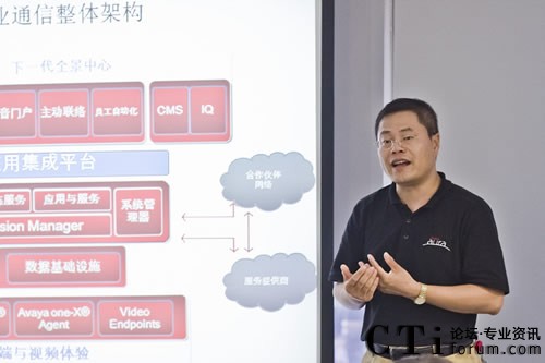 上圖為:Avaya中國區(qū)副總裁李農講解Avaya Aura 聯(lián)絡中心6.2系統(tǒng)架件
