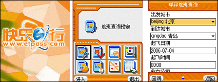 “快樂e行”預(yù)裝在手機(jī)中的存儲卡中,可直接安裝到手機(jī)的應(yīng)用菜單欄里,點(diǎn)擊圖標(biāo),就可以直接進(jìn)入首頁。圖形化的操作按鍵、簡明的文字提示、順暢的操作流程,人性化的設(shè)計讓機(jī)票預(yù)訂變得不再麻煩。
