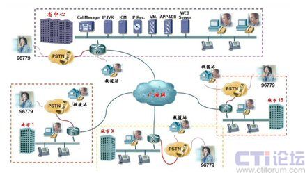 如上圖所示,由于Cisco IPCC是基于標(biāo)準(zhǔn)IP網(wǎng)絡(luò)的純IP呼叫中心解決方案,呼叫中心的核心設(shè)備都只部署在省中心機(jī)房,其它地市只需要在原有網(wǎng)絡(luò)的路由器上添加語音模塊即可實(shí)現(xiàn)PSTN語音的本地接入,而無需再各地市購買額外的接入設(shè)備。而同樣由于IP網(wǎng)絡(luò)的特性,呼叫中心的坐席可以根據(jù)需要部署在甘肅省運(yùn)輸管理局IP網(wǎng)絡(luò)可達(dá)的任何一個(gè)地方,各地市的坐席只需要配備IP電話和座席PC即可。來自PSTN的電話根據(jù)用戶在IVR中的選擇和其它路由策略,自動(dòng)分配到最適合的坐席處理,譬如來自白銀的運(yùn)政投訴由白銀市本地的運(yùn)政大廳座席人員處理。