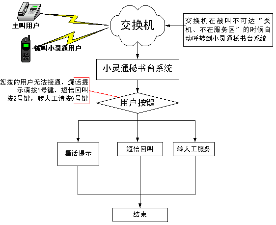 當(dāng)主叫用戶撥打被叫小靈通用戶,而被叫小靈通用戶處于不可達(dá)(關(guān)機(jī)、忙、不在服務(wù)區(qū))狀態(tài)時(shí),該呼叫自動(dòng)轉(zhuǎn)入轉(zhuǎn)到小靈通秘書(shū)臺(tái)系統(tǒng)后,用戶選擇短信回叫,系統(tǒng)在被叫小靈通用戶空閑后,會(huì)發(fā)送短信通知主叫用戶,被叫已經(jīng)恢復(fù)狀態(tài),可以呼叫。