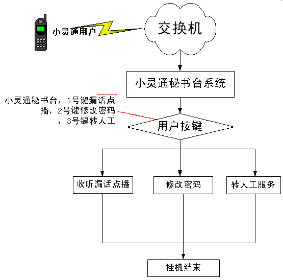 當(dāng)主叫用戶撥打被叫小靈通用戶,而被叫小靈通用戶處于不可達(dá)(關(guān)機(jī)、忙、不在服務(wù)區(qū))狀態(tài)時(shí),該呼叫自動(dòng)轉(zhuǎn)入轉(zhuǎn)到小靈通秘書(shū)臺(tái)系統(tǒng)后,用戶選擇1號(hào)鍵,系統(tǒng)會(huì)提示主叫用戶給被叫留言,留言成功后,小靈通秘書(shū)臺(tái)系統(tǒng)會(huì)發(fā)送短信給被叫通知被叫有語(yǔ)音留言。