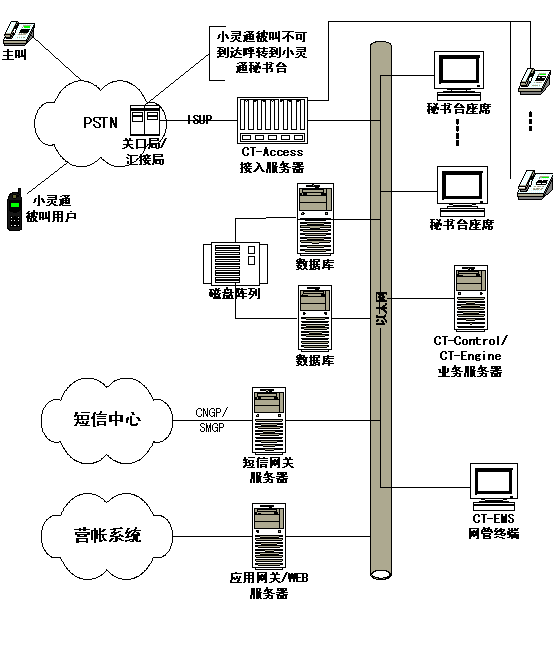 如上圖所示,小靈通秘書(shū)臺(tái)網(wǎng)絡(luò)拓?fù)鋱D,上圖中紅色虛線的左邊為運(yùn)營(yíng)商部分,紅線是接口部分, 紅色虛線的右邊是增加的小靈通秘書(shū)臺(tái)設(shè)備和工程實(shí)施部分。首先需要在小靈通網(wǎng)絡(luò)的關(guān)口局或者匯接局設(shè)置被叫不可到達(dá)(關(guān)機(jī)、忙、不在服務(wù)區(qū))呼叫前轉(zhuǎn),通過(guò)ISUP協(xié)議呼叫到小靈通秘書(shū)臺(tái)的CT-Access接入服務(wù)器,提取主叫號(hào)碼、被叫號(hào)碼、原被叫號(hào)碼,同時(shí)給主叫播放語(yǔ)音,"您撥的用戶無(wú)法接通,您可以選擇失話復(fù)得業(yè)務(wù),本業(yè)務(wù)每條短信收費(fèi)0.1元,漏話提示請(qǐng)按1號(hào)鍵,短信回叫請(qǐng)按2號(hào)鍵,轉(zhuǎn)人工請(qǐng)按9號(hào)鍵"。然后根據(jù)主叫的響應(yīng)選擇提供服務(wù)(業(yè)務(wù)流程見(jiàn)第3章)。小靈通秘書(shū)臺(tái)的業(yè)務(wù)部分由CT-Control/CT-Engine業(yè)務(wù)服務(wù)器和數(shù)據(jù)庫(kù)服務(wù)器組成,另外包括人工臺(tái)和短信網(wǎng)關(guān),短信網(wǎng)關(guān)通過(guò)CNGP(網(wǎng)通)、SMGP(電信)和短信中心網(wǎng)關(guān)接口,實(shí)現(xiàn)短信發(fā)送功能。業(yè)務(wù)網(wǎng)關(guān)和WEB服務(wù)器為可選部分,根據(jù)業(yè)務(wù)需要選配。