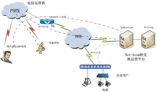 對需要400業(yè)務(wù)的呼叫中心客戶,需要申請一個“400xxxxxx”作為其在全國的統(tǒng)一接入碼;在全國任何范圍內(nèi),主叫用戶只需撥打該“400xxxxxx”號碼,無須加撥區(qū)號,便可按照企業(yè)業(yè)務(wù)用戶預(yù)先設(shè)定的方案,將呼叫直接接續(xù)到客戶所指定的電話號碼或呼叫中心。