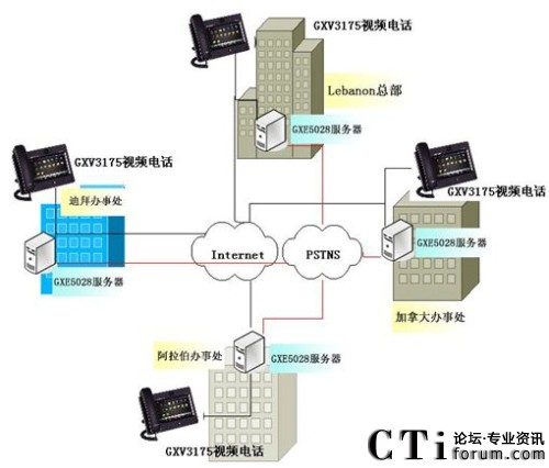 在Tabbara公司的全球四個(gè)辦事處分別安裝潮流網(wǎng)絡(luò)的GXE5028 IPPBX服務(wù)器或者其他的SIP Sever通信平臺(tái),GXE5028 IP PBX支持語音信箱,郵件和其他通信功能應(yīng)用,每一臺(tái)GXE5028最大限度地支持分布全球辦事處的所有通信賬號(hào)同時(shí)連接到同一網(wǎng)絡(luò)中,終端連接IP電話,IP視頻電話以及IP視頻監(jiān)控?cái)z像機(jī)作為語音/數(shù)據(jù)的輸入輸出,當(dāng)然IP PBX也可通過網(wǎng)絡(luò)連接到VoIP服務(wù)器中間位置的SIP中繼。潮流網(wǎng)絡(luò)的GXV3175多媒體觸摸屏視頻電話,支持標(biāo)準(zhǔn)的SIP協(xié)議,先進(jìn)的H.264/H.263/H.263+視頻壓縮標(biāo)準(zhǔn),寬大的7寸彩色觸摸顯示屏實(shí)現(xiàn)溝通面對(duì)面的零距離交流,以及撥打網(wǎng)絡(luò)攝像機(jī)觀看監(jiān)控現(xiàn)場(chǎng)。潮流網(wǎng)絡(luò)的GXV3662_HD高清防暴半球IP攝像機(jī)和GXV3651_HD IP攝像機(jī),分別安裝在辦事處關(guān)鍵位置,365天,每周24*7個(gè)小時(shí)進(jìn)行實(shí)時(shí)監(jiān)控,作為企業(yè)財(cái)產(chǎn)和人員安全的保障。方案中,各分支機(jī)構(gòu)之間通話免費(fèi),撥打分支機(jī)構(gòu)所在地其他電話按市話費(fèi)算,出差人員使用IP電話與公司內(nèi)部通話免費(fèi)。