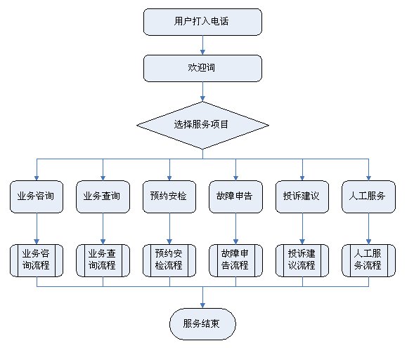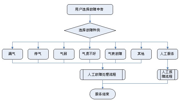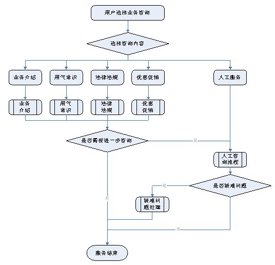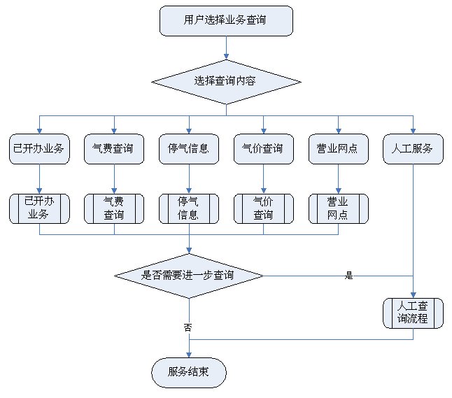 1)業(yè)務(wù)咨詢:用戶通過人工、自動語音等方式咨詢有關(guān)政策法規(guī)、資費標(biāo)準、用氣常識、報裝方法等,系統(tǒng)以語音、傳真、Email、短消息等方式回復(fù)客戶。