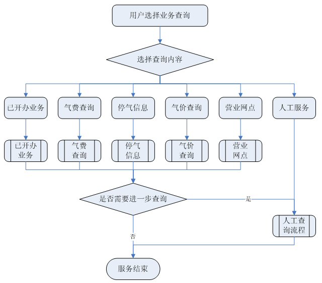 業(yè)務(wù)咨詢:用戶通過人工、自動(dòng)語(yǔ)音等方式咨詢有關(guān)政策法規(guī)、資費(fèi)標(biāo)準(zhǔn)、用氣常識(shí)、報(bào)裝方法等,系統(tǒng)以語(yǔ)音、傳真、Email、短消息等方式回復(fù)客戶。