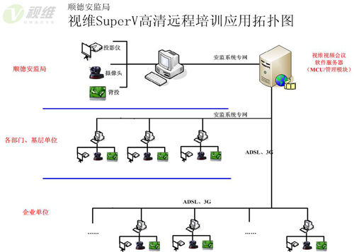 順德安監(jiān)局各部門及下屬單位使用安監(jiān)系統(tǒng)專網(wǎng)進(jìn)行連接,而重點(diǎn)培育企業(yè)網(wǎng)絡(luò)情況復(fù)雜,涉及ADSL以及3G無線網(wǎng)絡(luò)等多種情況,視維根據(jù)順德安監(jiān)局、局下屬單位及重點(diǎn)培育企業(yè)的分布情況,將服務(wù)器架設(shè)在順德安監(jiān)局總部,并在總部搭建會議室和培訓(xùn)中心,其他各部門、下屬單位和重點(diǎn)培育企業(yè)為分會場。