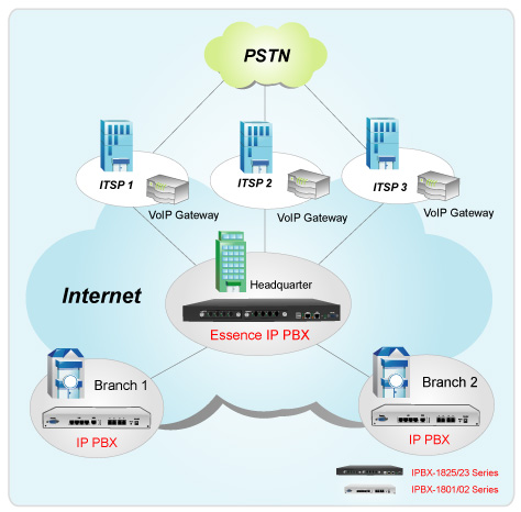 Essence IPBX系列可以注冊(cè)者之形式注冊(cè)于其他SIP協(xié)定伺服器上,如ITSP運(yùn)營(yíng)平臺(tái),或是分公司之小型IP PBX注冊(cè)至總公司之大型IP PBX ,均可透過(guò)Internet 將話務(wù)無(wú)限延伸。