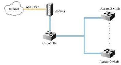 客房局域網(wǎng)通過一條6M的光纖接入CNC網(wǎng)絡(luò),網(wǎng)關(guān)設(shè)備承擔了DHCP、NAT和流量限制等功能,同時在思科6504上安裝有安全板卡,對內(nèi)部網(wǎng)絡(luò)安全進行加強和防御。由于每個客房有2~3個信息點,客房局域網(wǎng)總共有1300個左右的信息點。