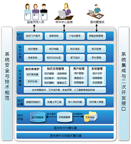 根據(jù)金融業(yè)用戶的需求,TRS運維知識管理平臺功能框架自下而上可分為知識存儲、知識采集、知識庫管理、知識應(yīng)用、知識門戶五大功能層,完全覆蓋用戶提出的所有功能需求。并且充分考慮系統(tǒng)安全,遵循技術(shù)規(guī)范,提供對外集成以及二次開發(fā)的接口與服務(wù)。