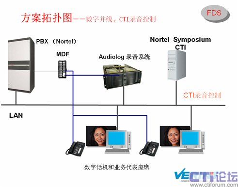 Audiolog錄音系統(tǒng)能和Nortel交換機(jī)、Symposium CTI進(jìn)行整合,獲取CTI隨路數(shù)據(jù)便于用戶錄音資料檢索。