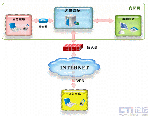 配置應(yīng)急座席的必要條件之一是網(wǎng)絡(luò)環(huán)境,要求應(yīng)急座席家庭計(jì)算機(jī)能夠連接到Internet或能夠直接訪問(wèn)客服系統(tǒng)內(nèi)部網(wǎng)絡(luò),位于客服網(wǎng)絡(luò)防火墻之外需要通過(guò)相應(yīng)的技術(shù)連接到系統(tǒng),實(shí)現(xiàn)對(duì)系統(tǒng)的訪問(wèn)。