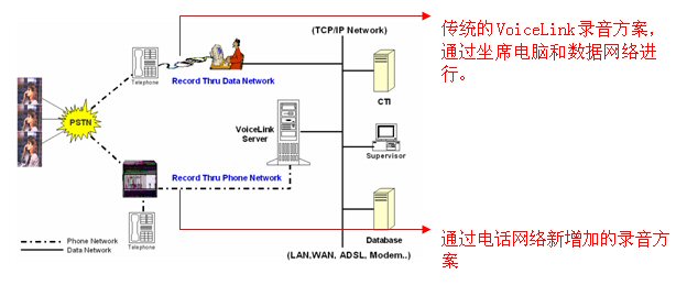 在Voicelink 電話網(wǎng)絡(luò)錄音方案下,語音可以通過每條的電話線獲得并能連接到Voicelink服務(wù)器上。語音將在Voicelink服務(wù)器里被處理,該服務(wù)器內(nèi)裝有語音卡。通過電話“摘機(jī)”和“掛機(jī)”的動(dòng)作來啟動(dòng)錄音和結(jié)束錄音。在TCP/IP的網(wǎng)絡(luò)下,主管可以調(diào)聽錄音并通過登陸到服務(wù)器上進(jìn)行用戶管理。