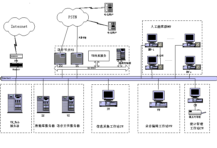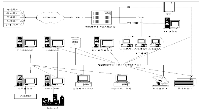 客戶(hù)服務(wù)中心系統(tǒng)包含智能排隊(duì)機(jī)(含接入服務(wù)器)、核心服務(wù)器CCS、交互式語(yǔ)音應(yīng)答系統(tǒng)IVR、語(yǔ)音傳真服務(wù)器、業(yè)務(wù)服務(wù)器、工作流服務(wù)器、數(shù)據(jù)庫(kù)服務(wù)器、Internet/Intranet服務(wù)器、人工座席、尋呼機(jī)接口,手機(jī)短消息接口等組成。如下圖所示為Runsun呼叫中心系統(tǒng)結(jié)構(gòu)圖: