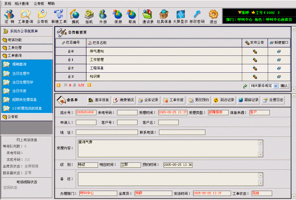 系統(tǒng)聯(lián)通了座席員、營業(yè)廳業(yè)務(wù)員、工程管理人員、維修網(wǎng)點(diǎn)派工人員、外勤維修人員、公司管理人員等各種角色使用系統(tǒng)的界面。