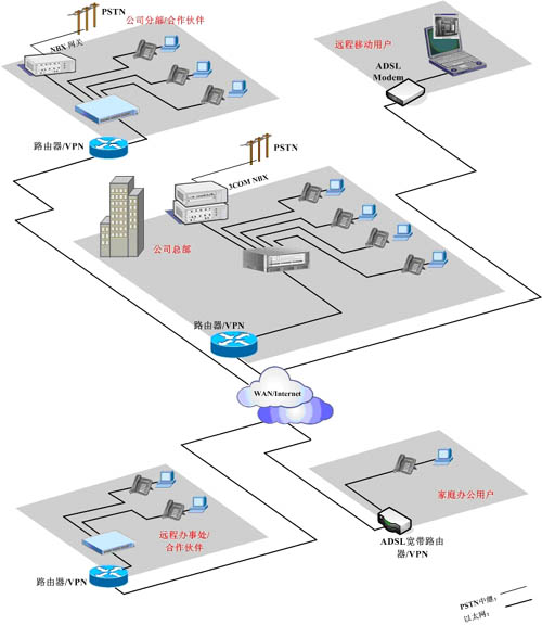 - 采用3COM NBX系統(tǒng)我們可以為用戶提供移動(dòng)的、靈活的辦公電話系統(tǒng),本系統(tǒng)的遠(yuǎn)程Internet接入采用ADSL或?qū)>方式。