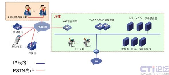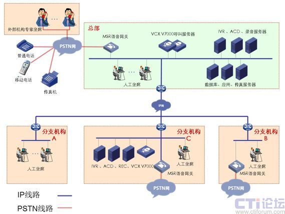 分支機(jī)構(gòu)B:網(wǎng)絡(luò)通過VPN技術(shù)與總部實(shí)現(xiàn)數(shù)據(jù)語音傳輸,部署MSR語音網(wǎng)關(guān)與當(dāng)?shù)豍STN網(wǎng)連接,IP坐席。兩地申請(qǐng)相同的客服號(hào)碼,兩地內(nèi)撥打客服號(hào)碼,客戶無長(zhǎng)途話費(fèi)產(chǎn)生。適用與總部與分支處在不同省市。