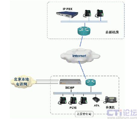 如上圖所示,通過SE30P的內(nèi)置FXO接口,可以實(shí)現(xiàn)與北京PSTN網(wǎng)絡(luò)的互聯(lián),解決北京分公司與中國用戶的通信;通過SE30P的IP中繼方式,實(shí)現(xiàn)與總部的IP PBX互聯(lián),變國際長途為內(nèi)部通話,為公司節(jié)省了大量辦公費(fèi)用;公司內(nèi)部使用IP話機(jī)作為人工總機(jī)和分機(jī),并通過ATA實(shí)現(xiàn)傳真接入。